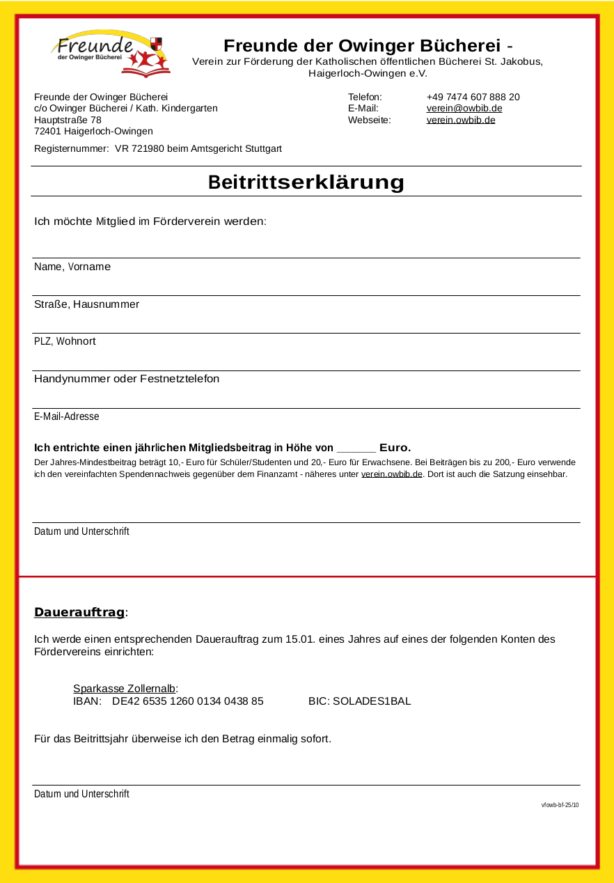 Mitglied im Förderverein kann jede natürliche und juristische Person und Personengesellschaft werden. Die Aufnahme ist schriftlich zu beantragen. Beitrittserklärungen gibt es in der Bücherei bzw. können auf dieser Seite als PDF-Datei heruntergeladen werden: